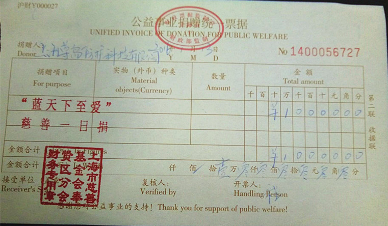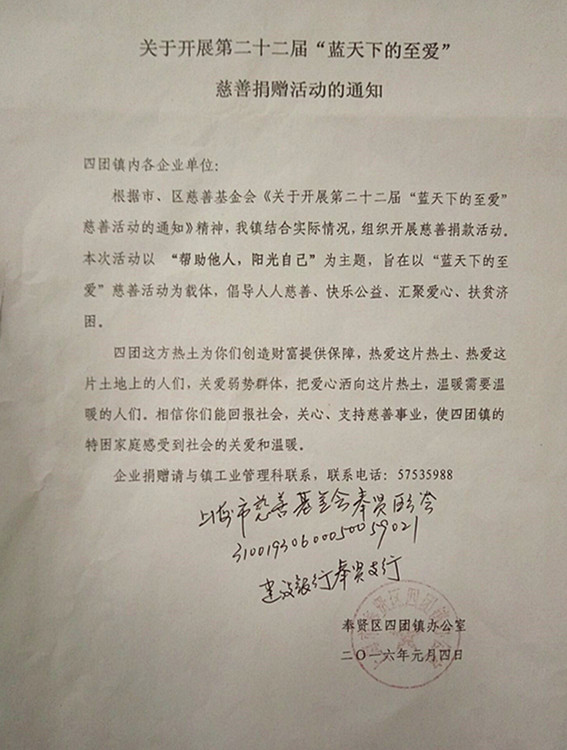 眾幸股份的下屬公司上海尊島防護(hù)科技有限公司響應(yīng)四團(tuán)鎮(zhèn)人民政府的號召,積極參與公益事業(yè),為第二十二屆“藍(lán)天下的至愛”慈善活動(dòng)添磚加瓦,貢獻(xiàn)自己的綿薄之力。